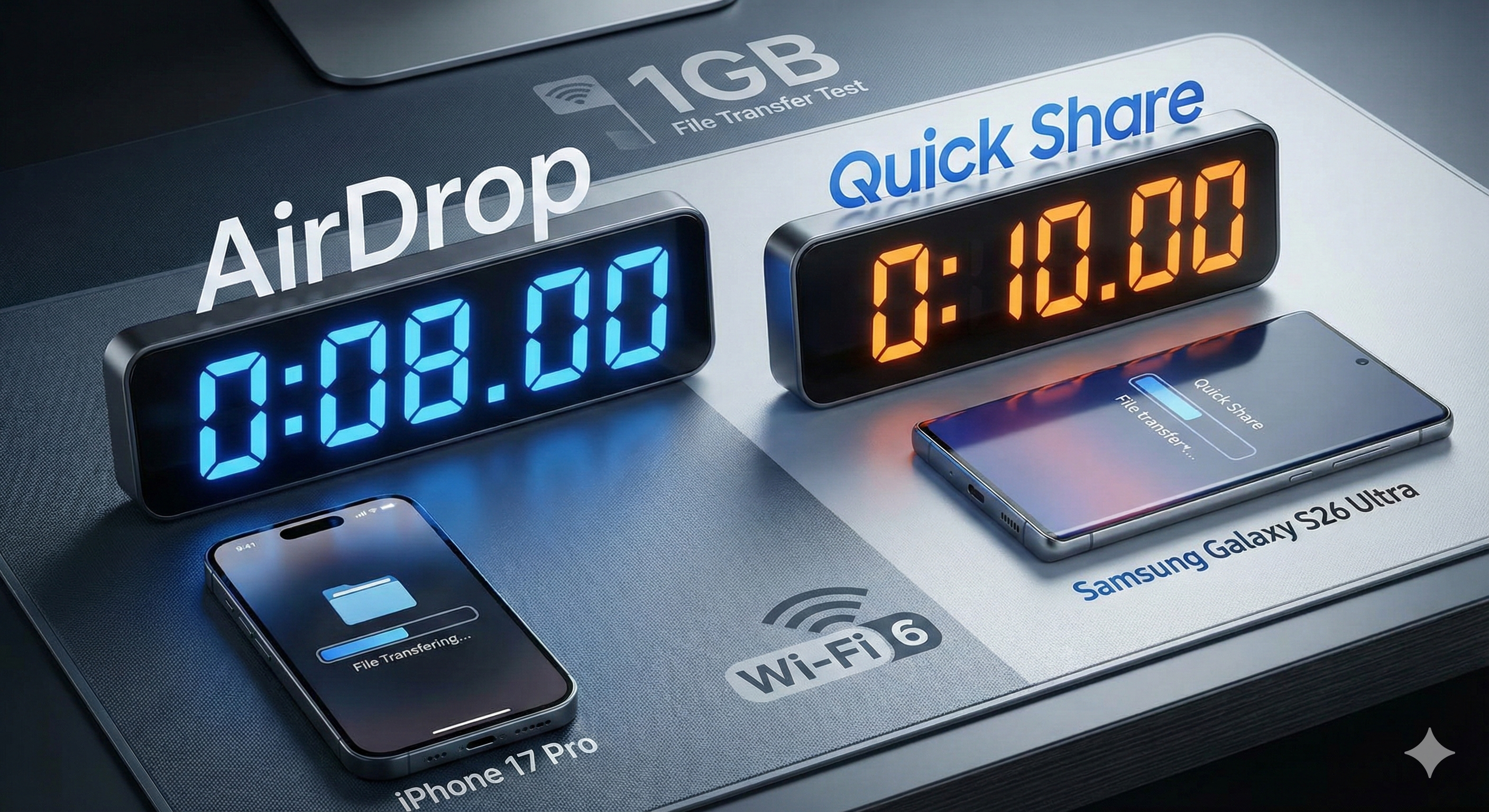 전송 속도 테스트는 Wi-Fi 6 환경에서, 최신 플래그십 모델(갤럭시 S26 Ultra와 아이폰 17 Pro)을 이용해 진행했습니다.