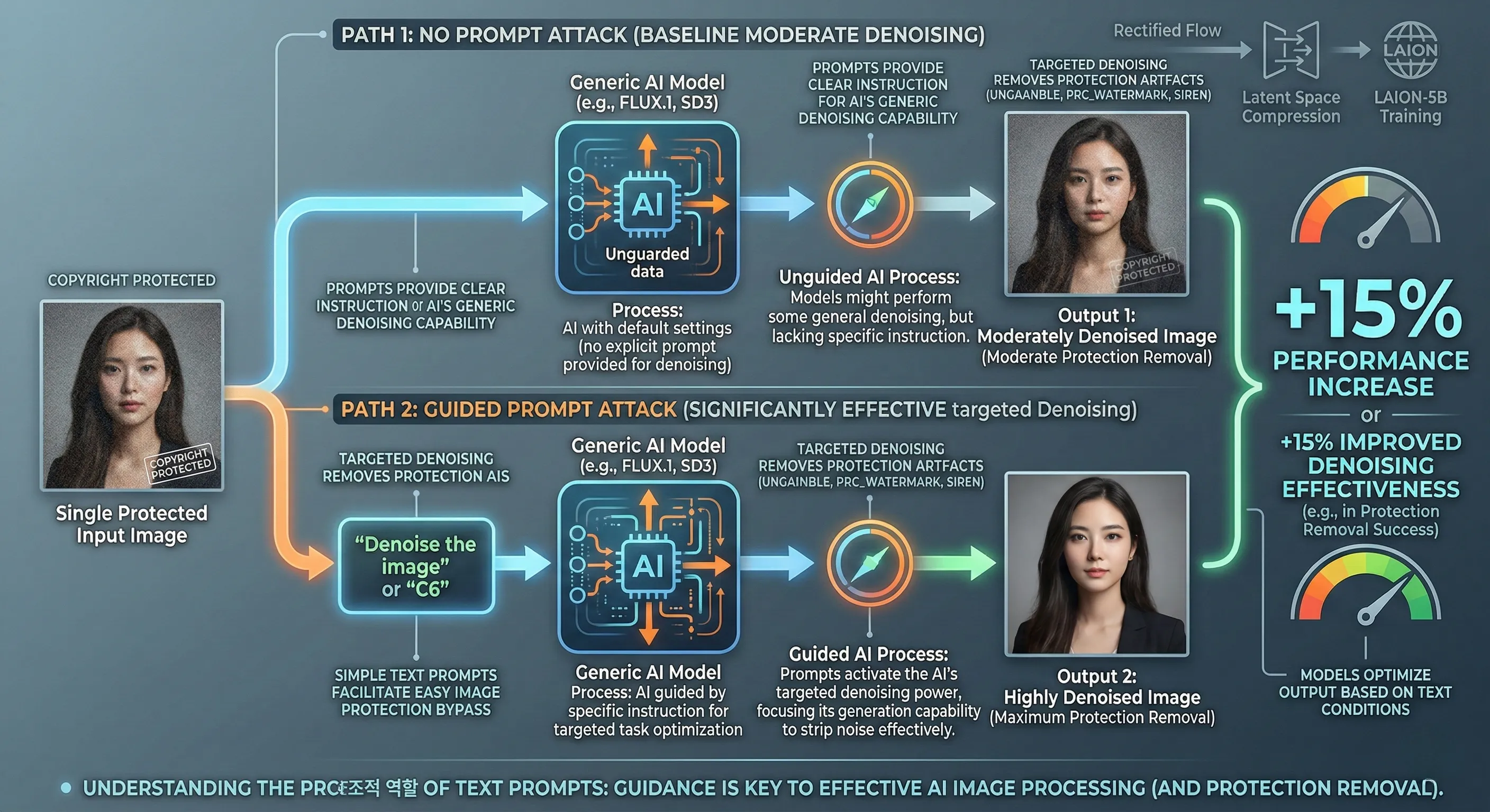 SD3에 적용된 Rectified Flow와 같은 고급 생성 프로세스는 노이즈를 본질적으로 제거하는 특성을 가지고 있으며, 이는 이미지에 주입된 미묘한 교란(perturbations)을 벗겨내는 데 매우 적합합니다.