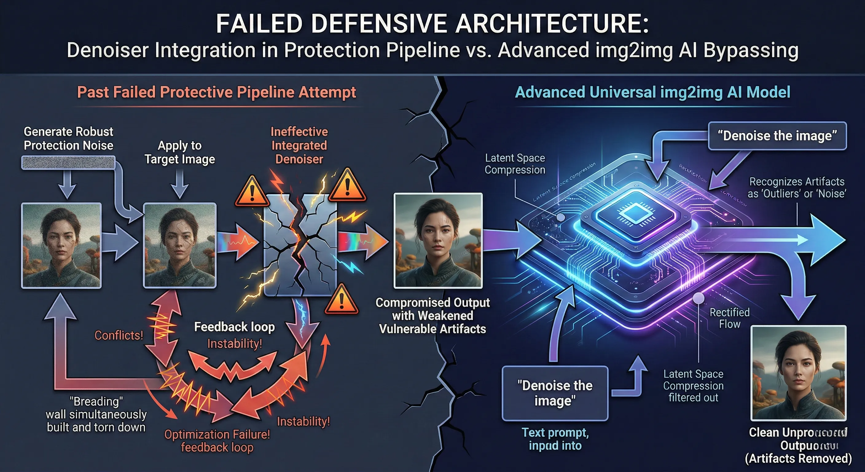 - 방어의 딜레마: 기존 방어 기술은 노이즈 제거기를 통합하려는 시도에서 최적화 불안정성 문제에 직면했으며, 첨단 img2img 모델의 본질적인 노이즈 제거 능력에 속수무책입니다.