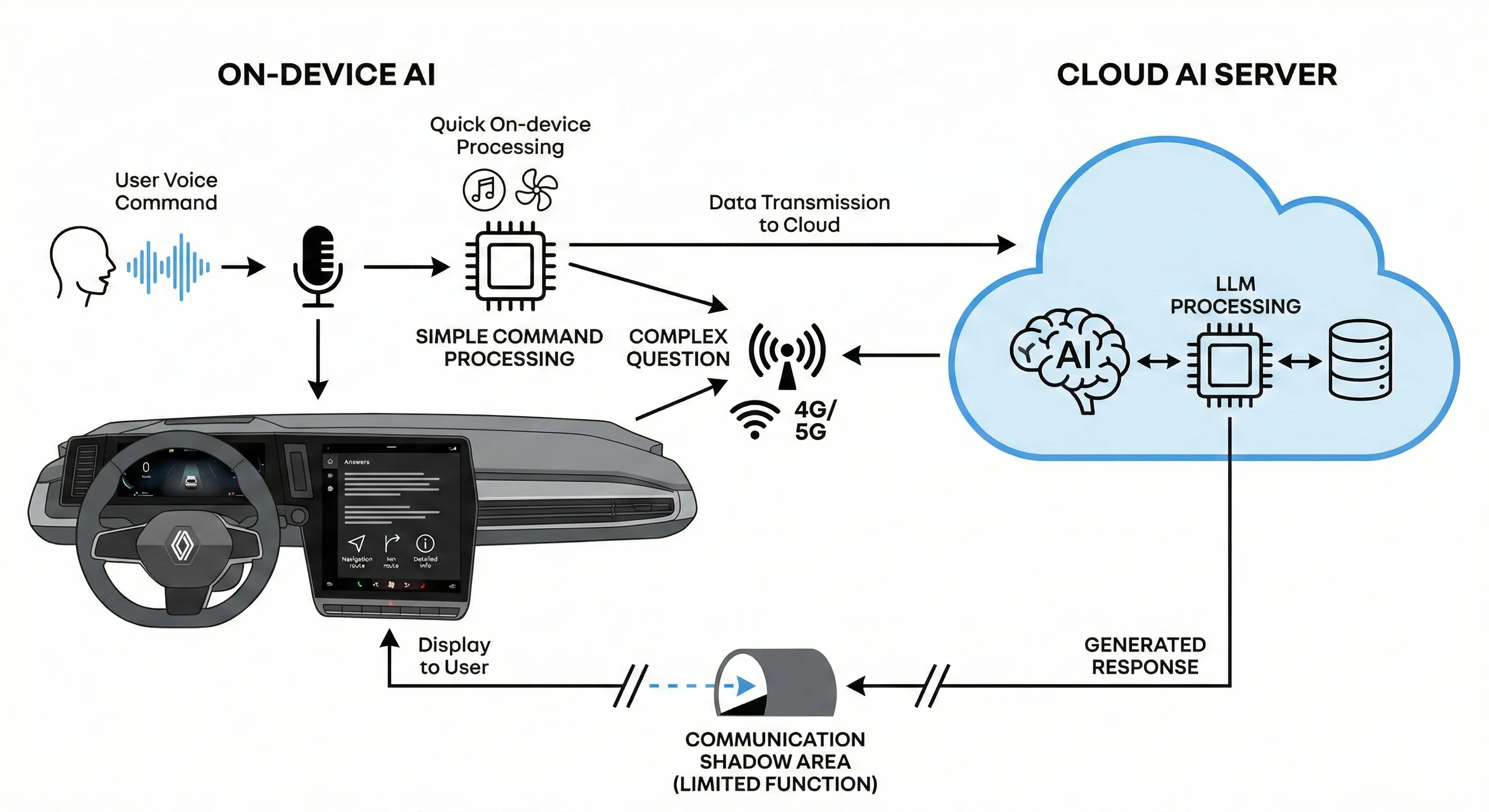 르노 필랑트의 AI 시스템은 사용자의 음성 명령 인식과 같은 간단한 처리는 온디바이스(On-device)에서 수행하여 빠른 반응 속도를 확보합니다.