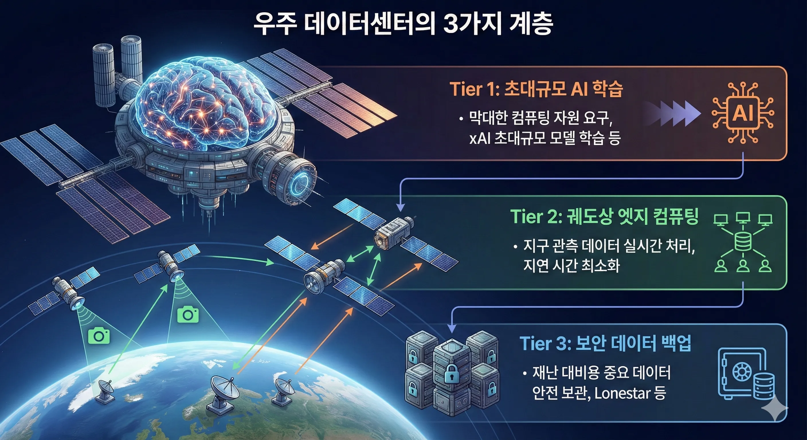 Tier 1은 xAI의 초대규모 AI 모델 학습과 같이 막대한 컴퓨팅 자원을 요구하는 시장, Tier 2는 지구 관측 위성의 실시간 데이터 처리를 위한 궤도상 엣지 컴퓨팅, Tier 3는 Lonestar와 같은 재난 대비용 보안 데이터 백업 시장입니다.