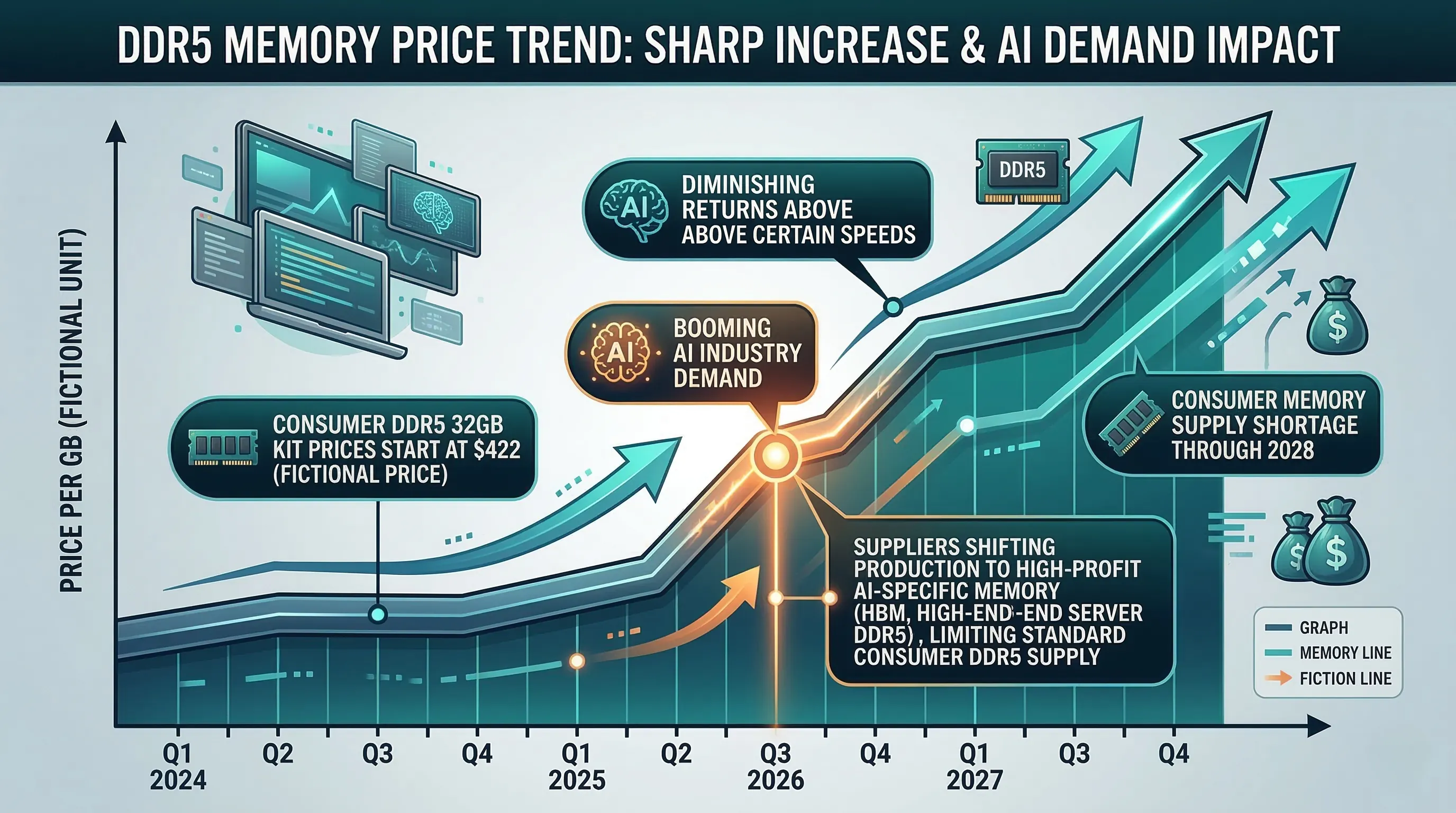AI 기술 발전에 따른 메모리 수요 폭증은 이미 시장에 큰 파장을 일으키고 있으며, DDR5 32GB 키트의 가격은 422달러부터 시작하는 등 소비자들에게 상당한 부담으로 작용하고 있습니다.