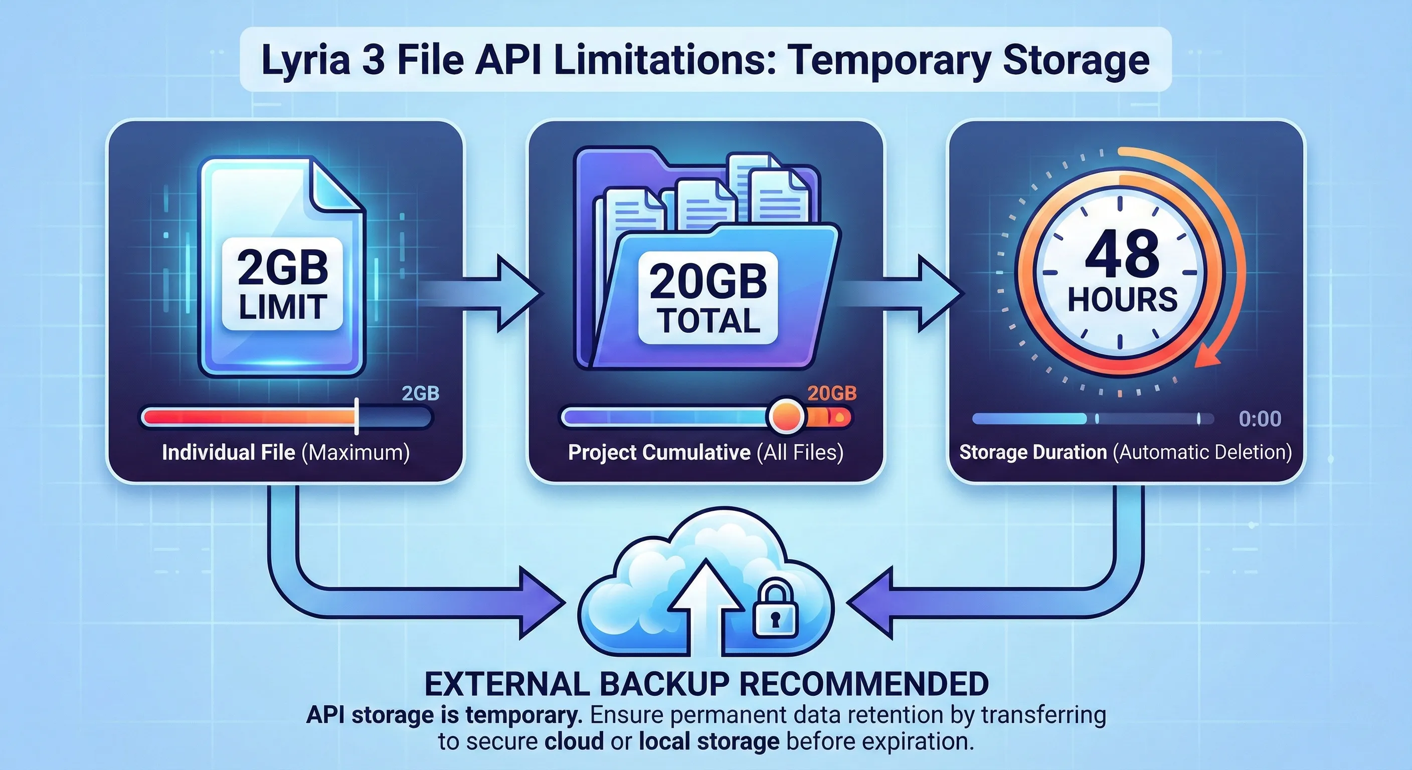한편, Lyria 3 API의 File API는 개발자가 처리해야 할 데이터의 물리적 한계를 명확히 규정합니다.