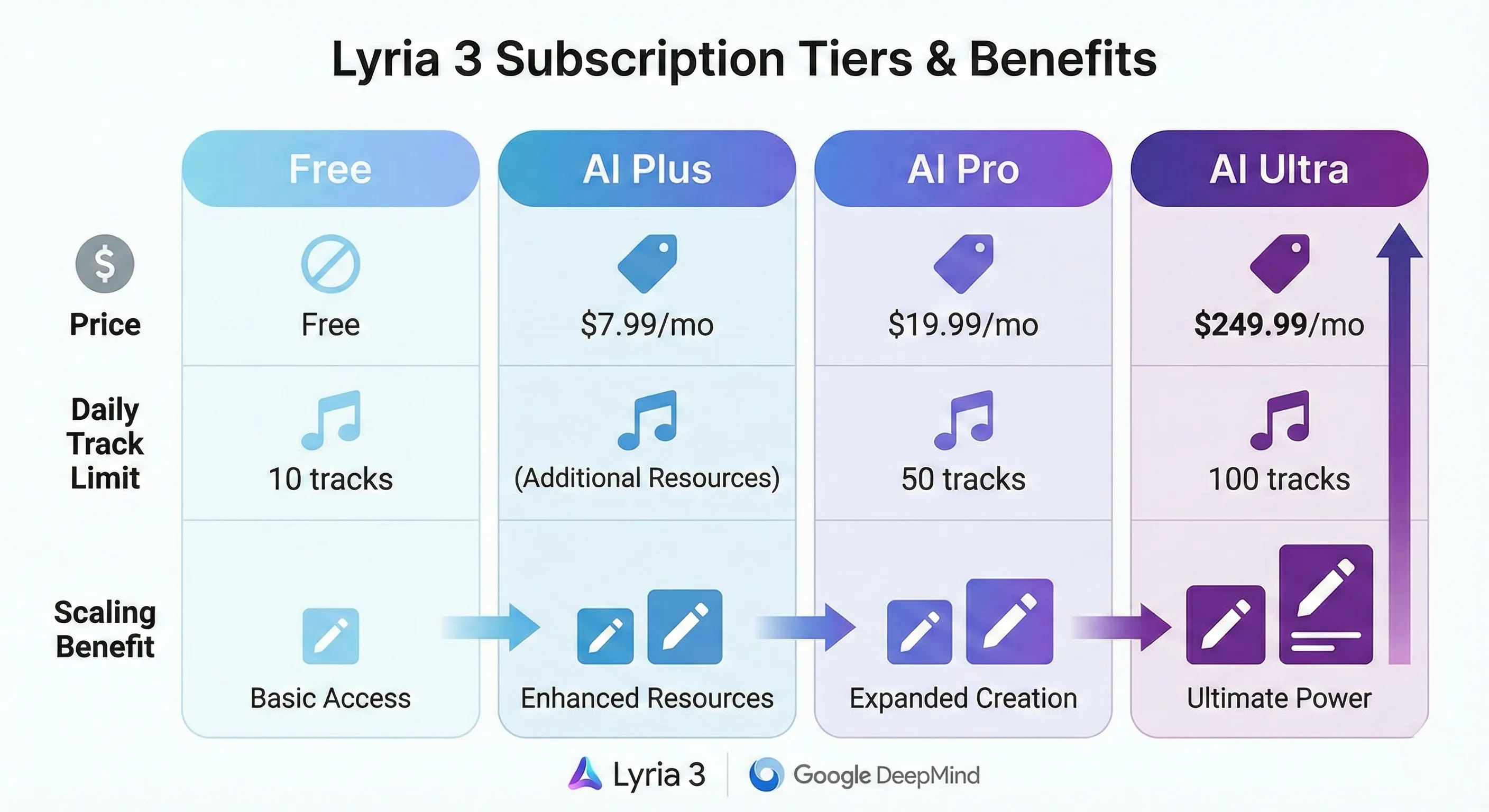 2. 월 $7.99부터 $249.99까지: Lyria 3 세부 요금제 및 사용량 제한 분석