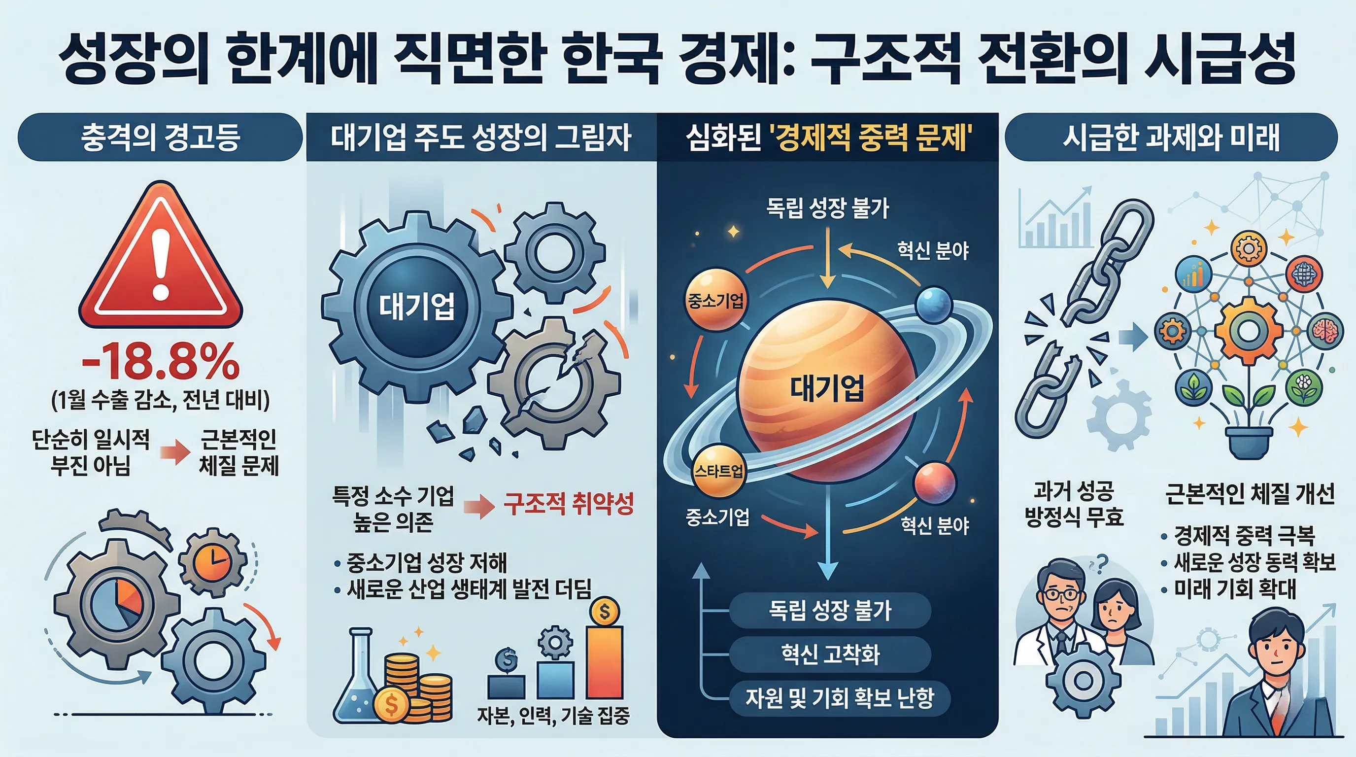 이는 단순히 일시적인 부진을 넘어, 대기업 주도 경제 성장의 한계와 이로 인해 발생하는 '경제적 중력 문제'라는 근본적인 체질 문제를 시사합니다.