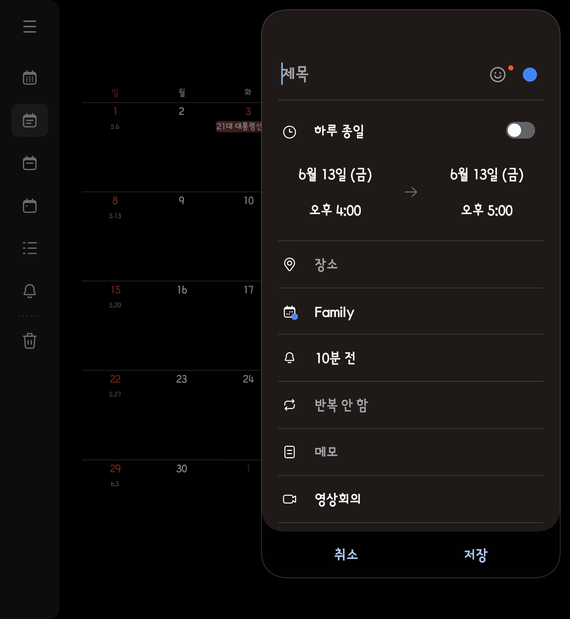 제목, 날짜, 시간, 장소는 물론이고, 반복 여부, 알림 설정까지 세밀하게 조절할 수 있어요." - 활용: 병원 예약, 약 복용 시간, 가족 생일, 계모임 날짜 등을 캘린더에 입력하고, 미리 알림을 설정하여 잊지 않도록 합니다.
