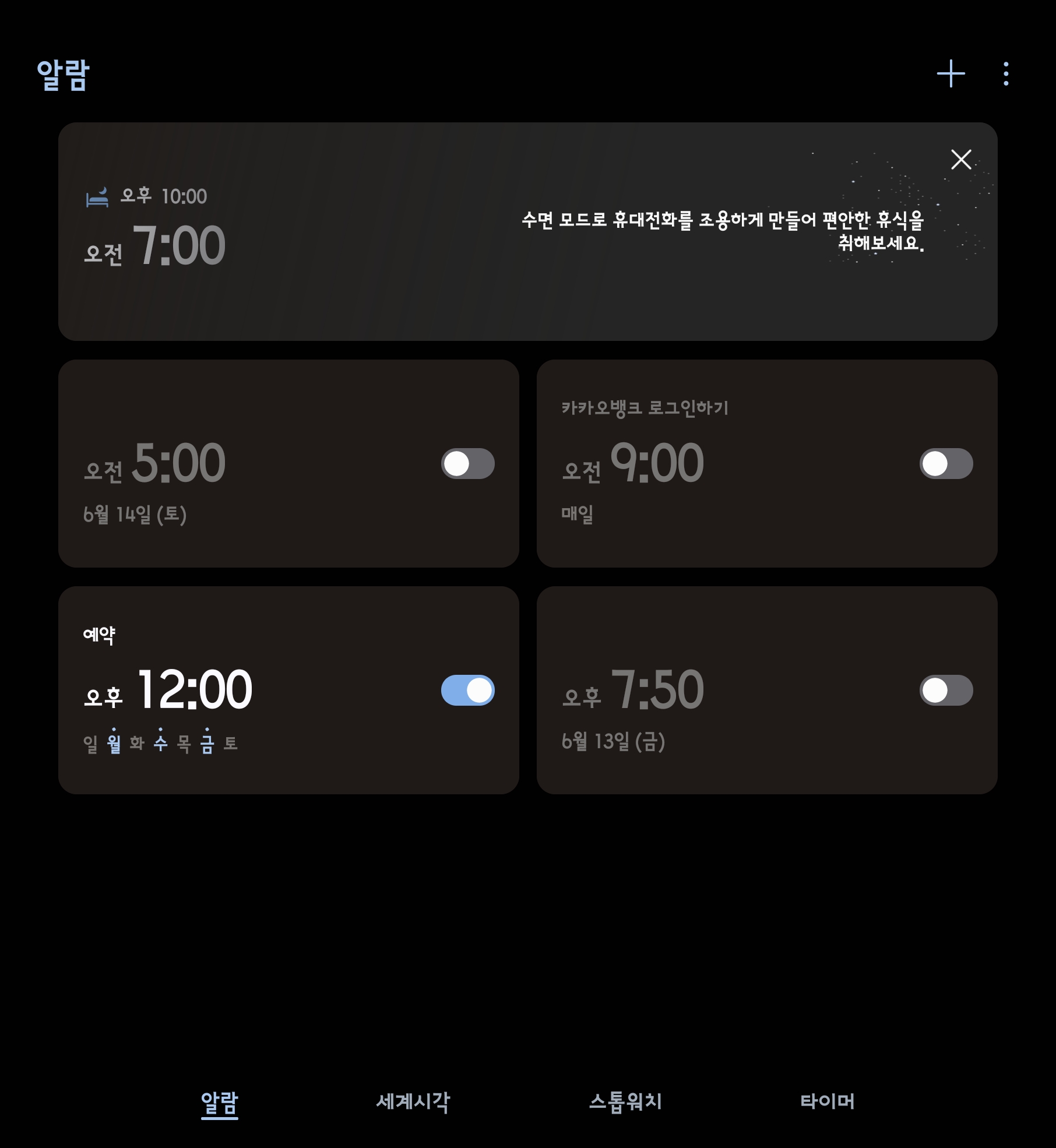 - '+' 버튼을 눌러 새로운 알람을 추가하거나, 기존 알람을 터치하여 수정할 수 있습니다.