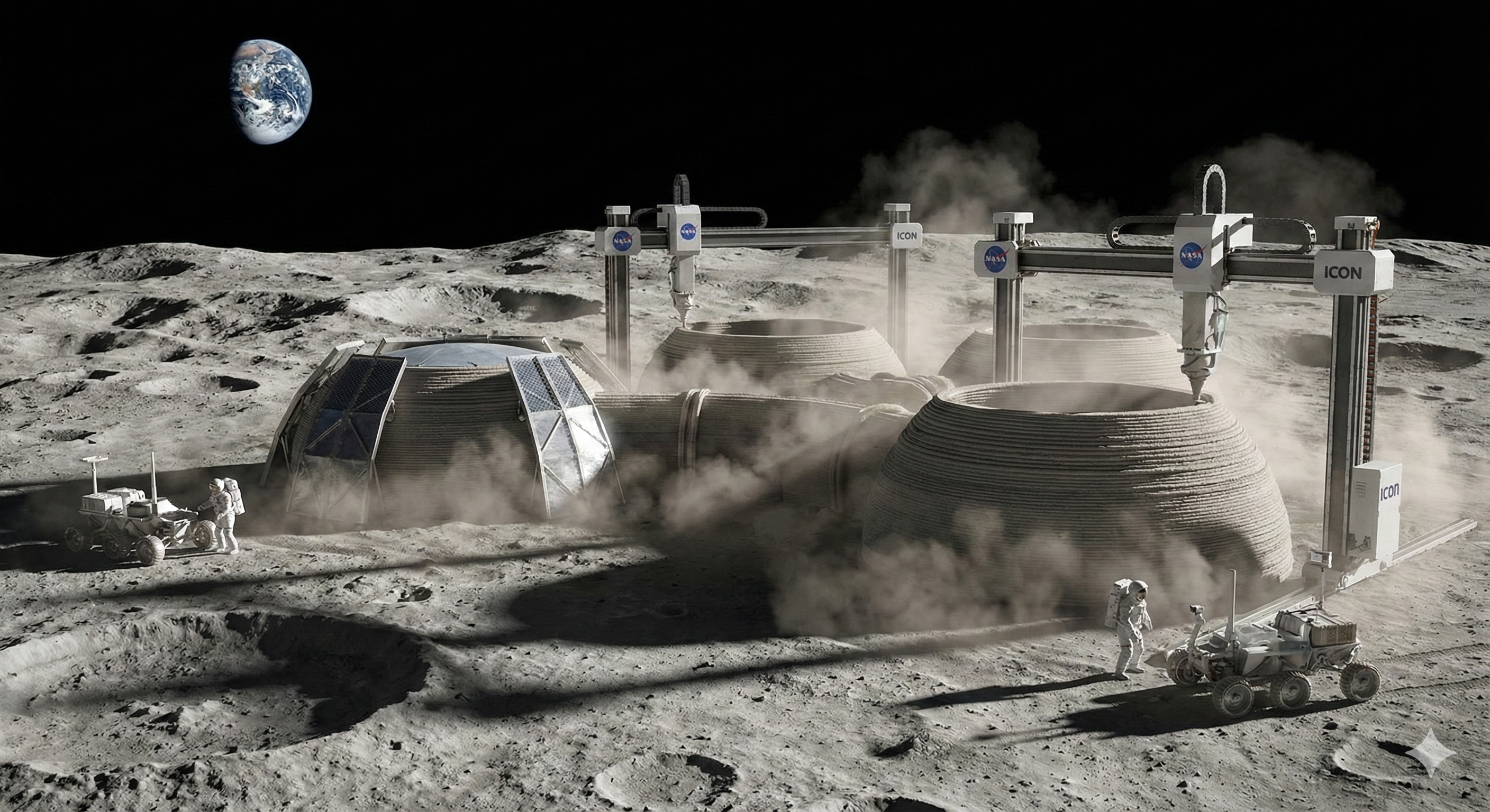 우주 거주지 건설의 핵심은 바로 현지 재료(예를 들어, 달의 월면토나 화성의 표토)를 활용한 3D 프린팅 기술입니다.