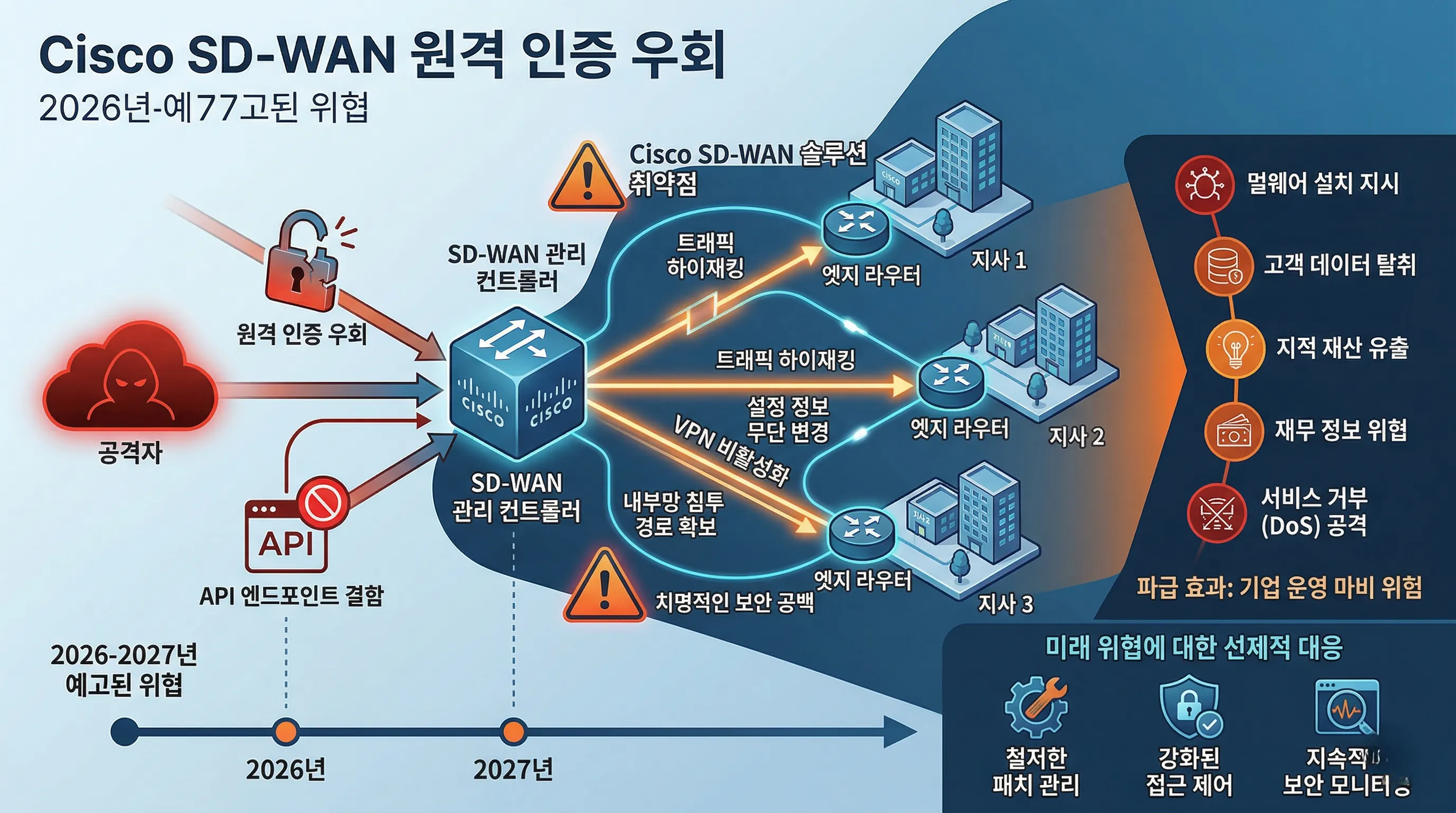 - 2026년부터 2027년 사이에 시스코(Cisco) SD-WAN 원격 인증 우회 취약점이 예고되어, 네트워크 장악 및 치명적인 피해를 야기할 수 있다는 우려가 커지고 있습니다.