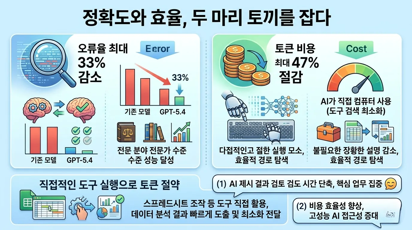 정확도 향상과 더불어 GPT-5.4는 비용 효율성 측면에서도 주목할 만한 성과를 보였습니다.
