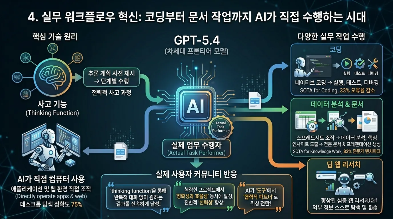 GPT-5.4는 '생각하는 기능'을 통해 추론 계획을 먼저 제시하고, 'AI가 컴퓨터를 직접 사용'하며 '애플리케이션 및 웹 환경을 직접 조작'할 수 있습니다.