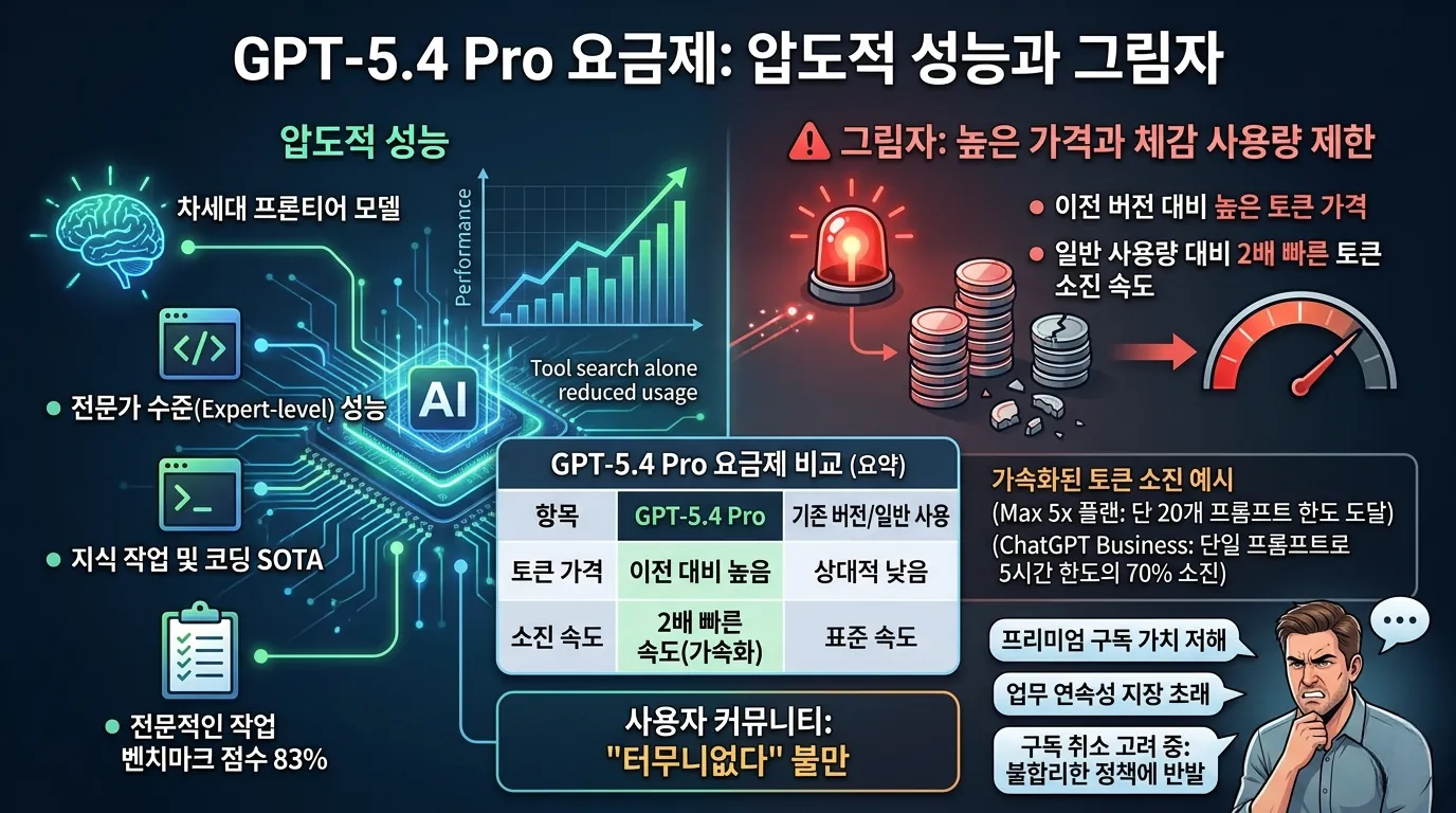 - GPT-5.4 Pro 요금제는 높은 토큰 가격과 2배 빠른 소진율로 사용자 불만이 제기되고 있습니다.