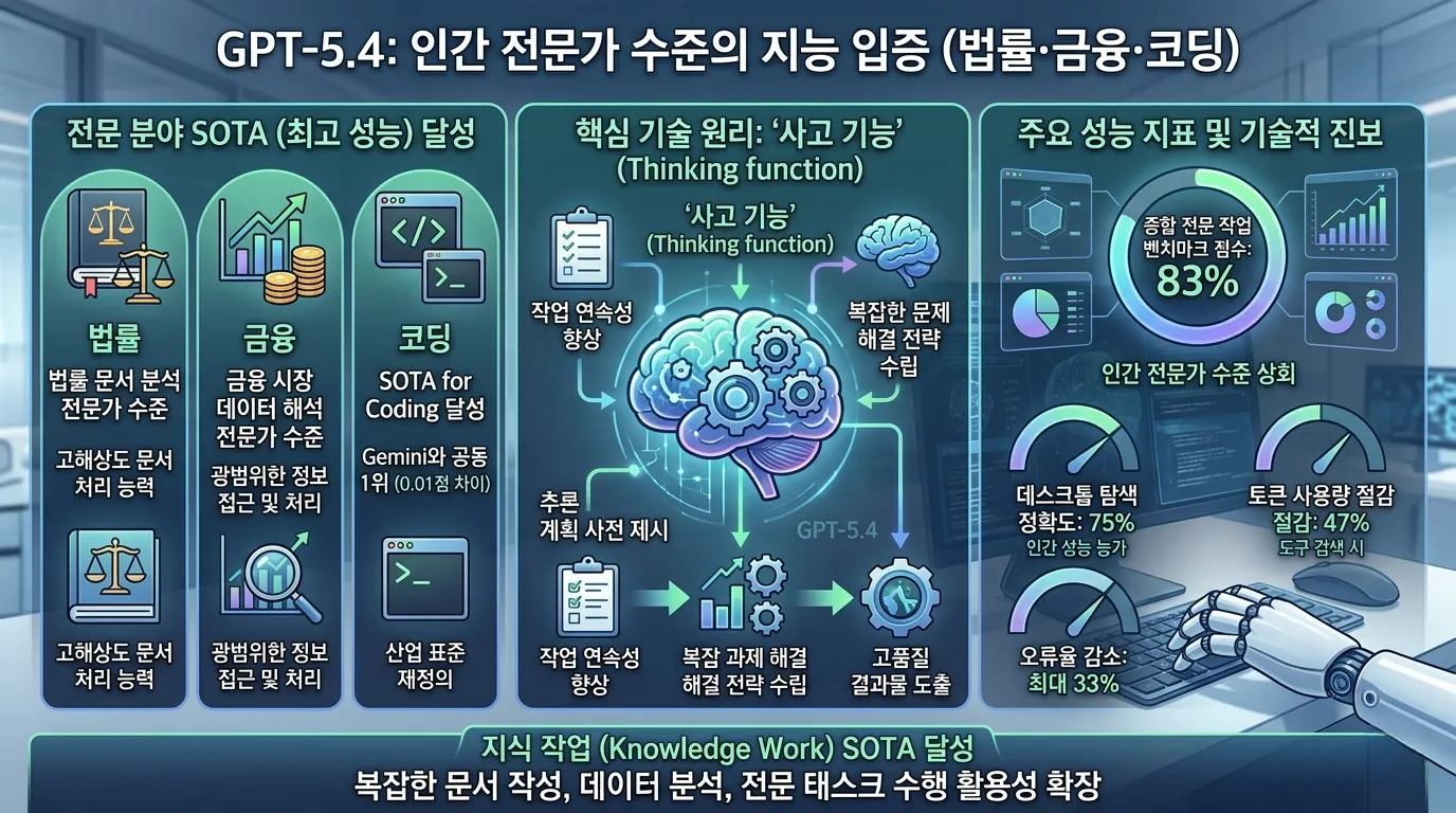 차세대 프론티어 모델인 GPT-5.4는 법률, 금융과 같은 고난도 전문 분야에서 획기적인 전문가 수준(Expert-level) 성능을 입증했습니다.