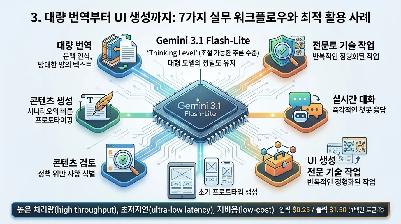 Gemini 3.1 Flash-Lite는 개발자 가이드에서 언급된 7가지 실무 워크플로우, 즉 '대량 번역', '콘텐츠 검토', 'UI 생성', '시뮬레이션 설계', '실시간 서비스 구축' 등을 포함한 다양한 작업에 최적화되어 있습니다.