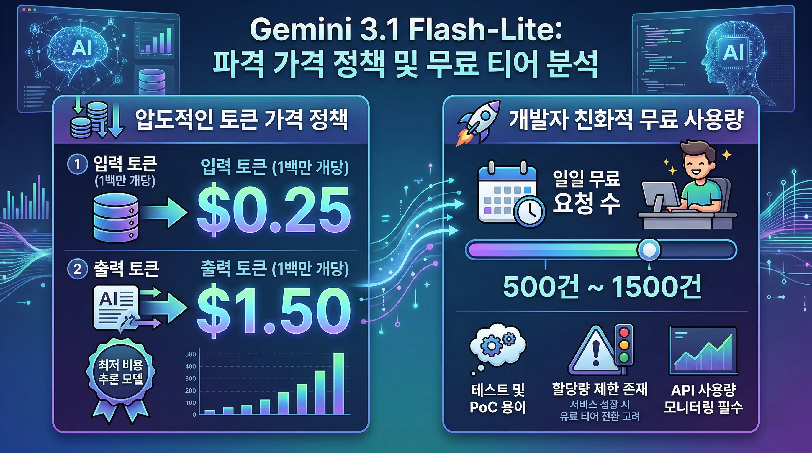 이러한 무료 사용량 정책은 개발자들이 부담 없이 AI 기능을 실험하고, 자신의 애플리케이션에 Gemini 3.1 Flash-Lite를 도입하는 초기 장벽을 크게 낮추는 역할을 합니다.
