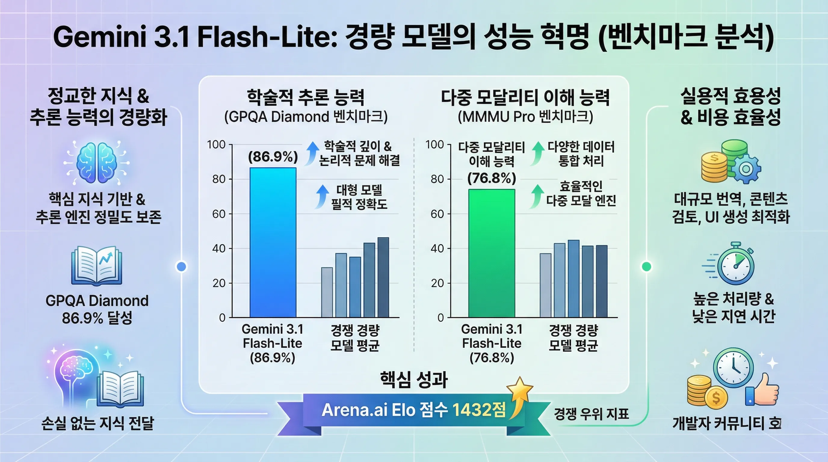 이러한 수치들은 Gemini 3.1 Flash-Lite가 단순히 '가볍다'는 개념을 넘어, 복잡한 추론과 다중 모달리티 이해 능력을 효과적으로 유지하고 있음을 시사합니다.