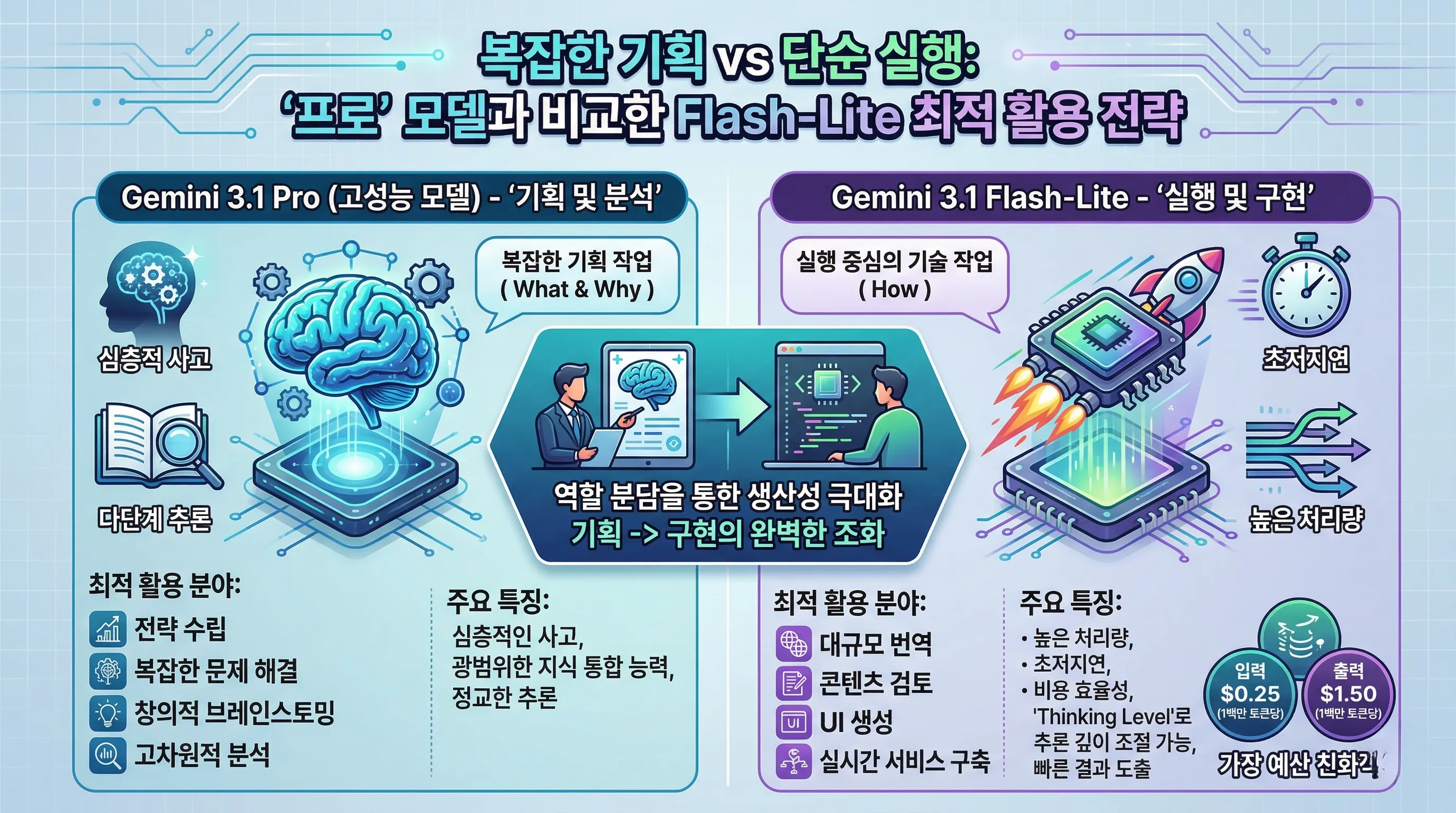 즉, '무엇을(What)' 결정하고 '왜(Why)'를 분석하는 고차원적 기획 작업에는 Pro 모델을, 그리고 결정된 기획을 바탕으로 '어떻게(How)'를 구현하는 실행 작업에는 Flash-Lite를 활용하는 것이 생산성과 비용 효율성 모두를 극대화하는 전략입니다.