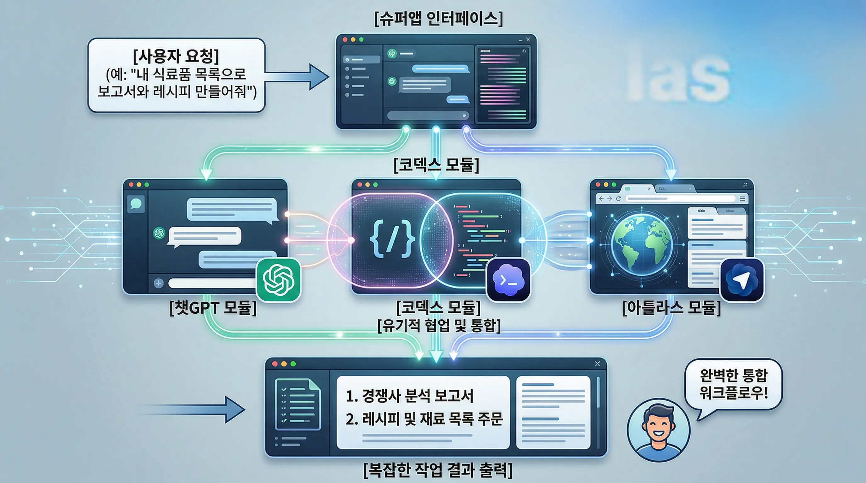 예를 들어, 사용자가 "이 레시피에 필요한 재료를 주문해 줘"라고 명령하면, AI는 아틀라스 브라우저로 식료품점을 탐색하고, 코덱스로 주문 프로세스를 자동화하며, 챗GPT로 사용자에게 주문 내역을 확인하는 등 일련의 복잡한 작업을 능동적으로 처리할 수 있게 됩니다.