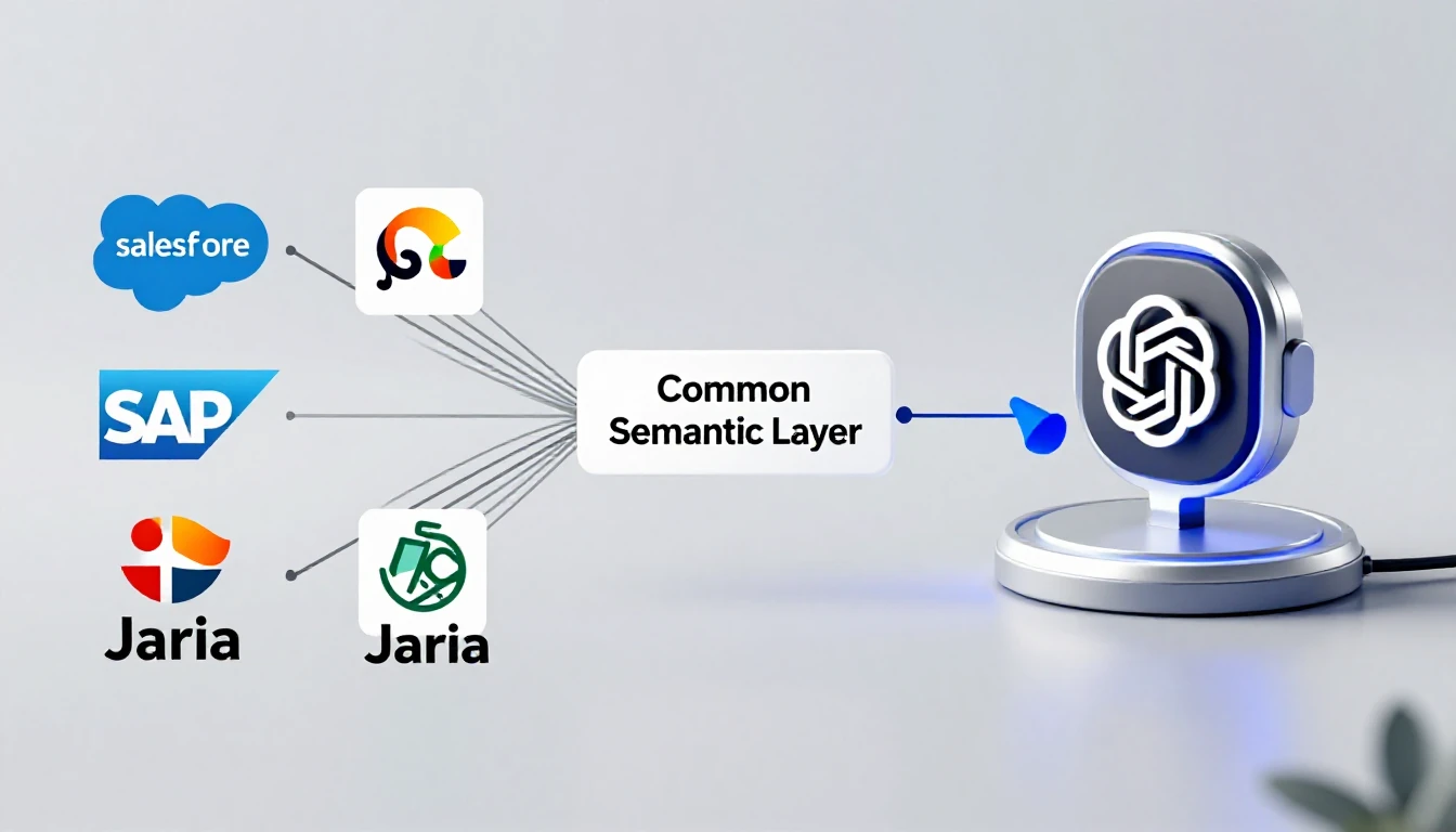 Frontier는 기업 내 분산된 데이터 웨어하우스, CRM, ERP, 내부 앱 등 이기종 데이터 소스를 연결하여 '공통 시맨틱 레이어(Common Semantic Layer)'를 구축합니다.