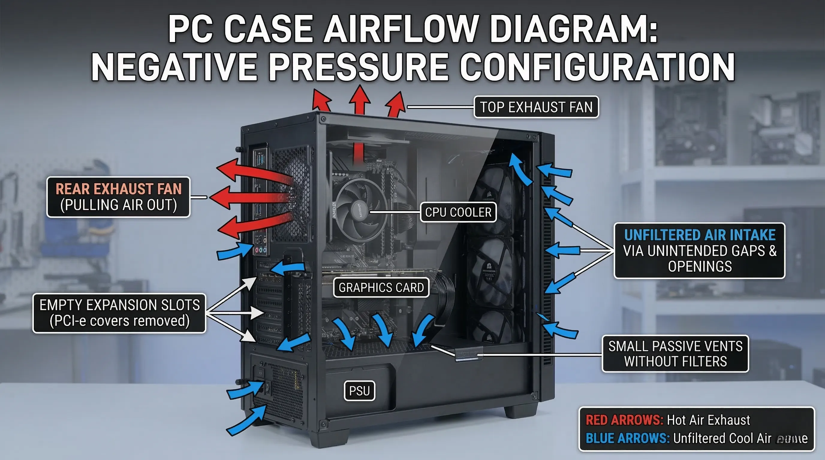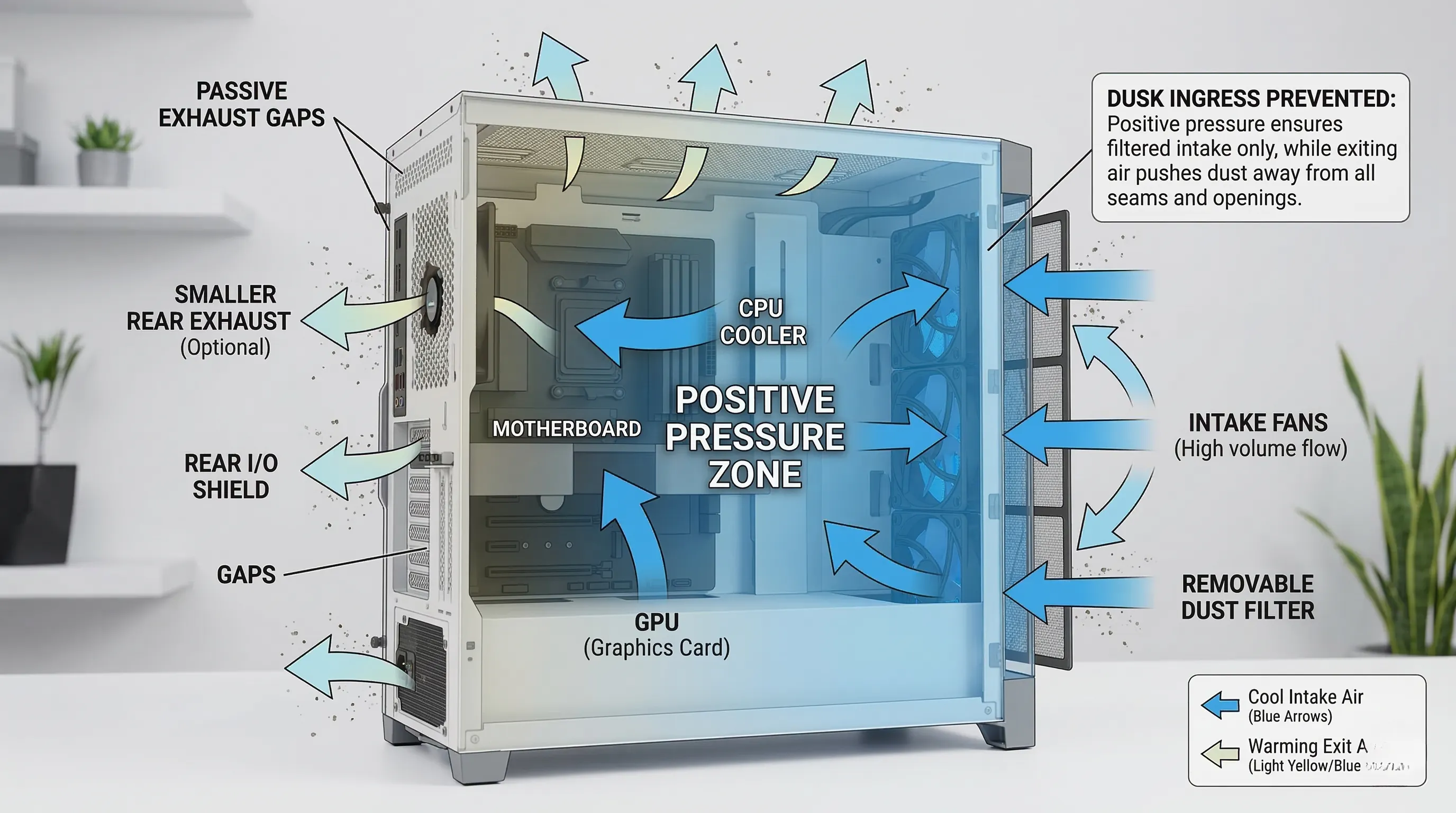 흡기 팬이 있더라도 배기 팬의 성능이 훨씬 강력하거나 흡기구가 적절히 밀봉되지 않으면, 필터를 거치지 않은 공기가 케이스의 패널 틈새, PCI 슬롯, 또는 기타 의도치 않은 공간을 통해 유입됩니다.