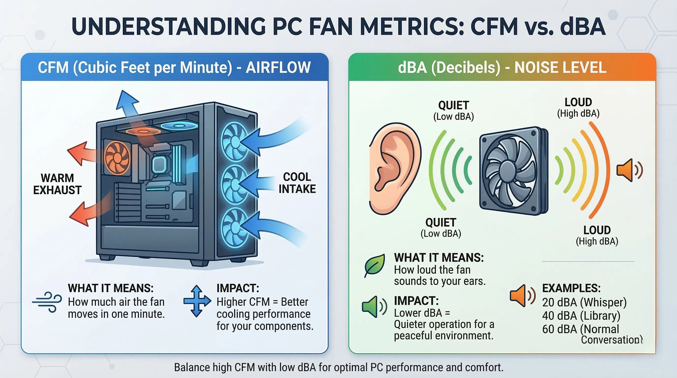 - CFM(풍량)과 dBA(소음)은 PC 팬 성능의 핵심 지표이며, 높은 CFM과 낮은 dBA의 균형 잡힌 팬이 최적의 사용자 경험을 제공합니다.