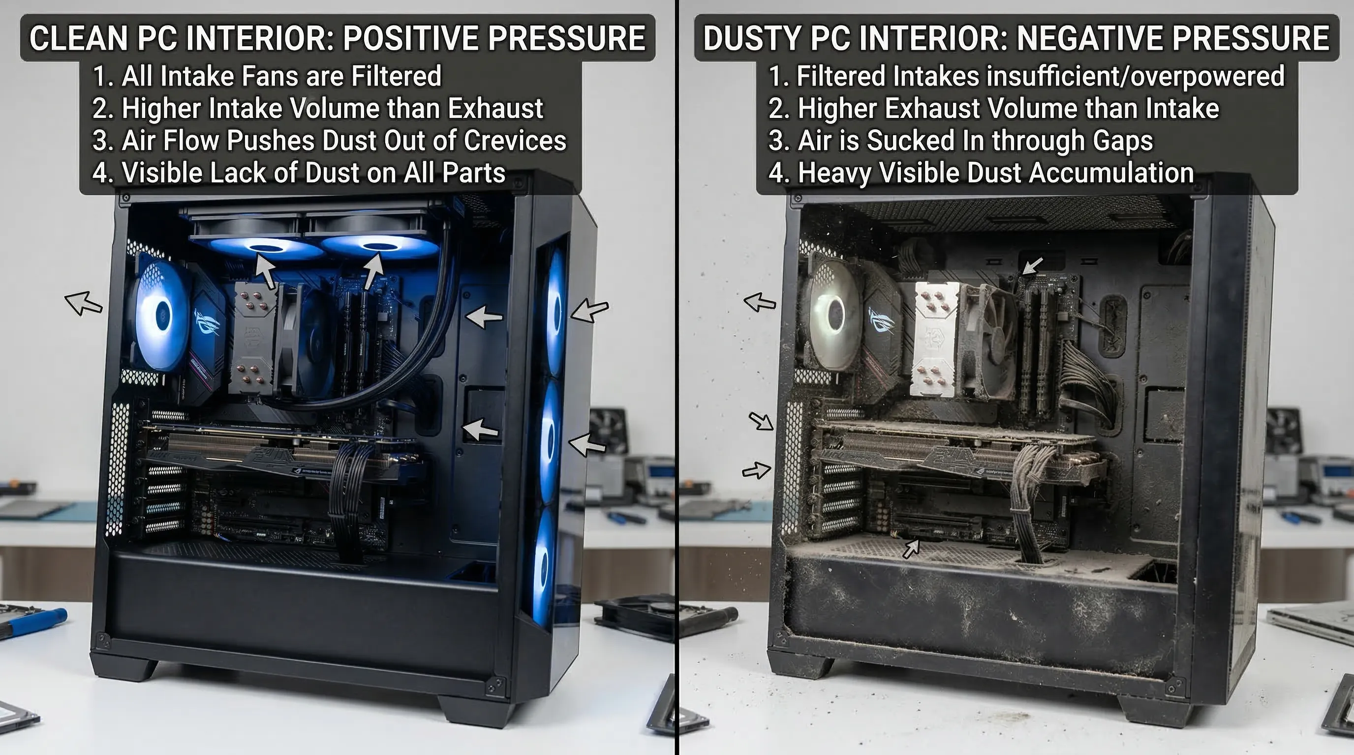 이러한 원리로 인해 내부 부품에는 더 빠르게 먼지가 쌓이게 되며, 이는 장기적으로 PC 부품의 수명을 단축시키고 최적의 냉각 효율성을 저해하는 요인으로 작용합니다.